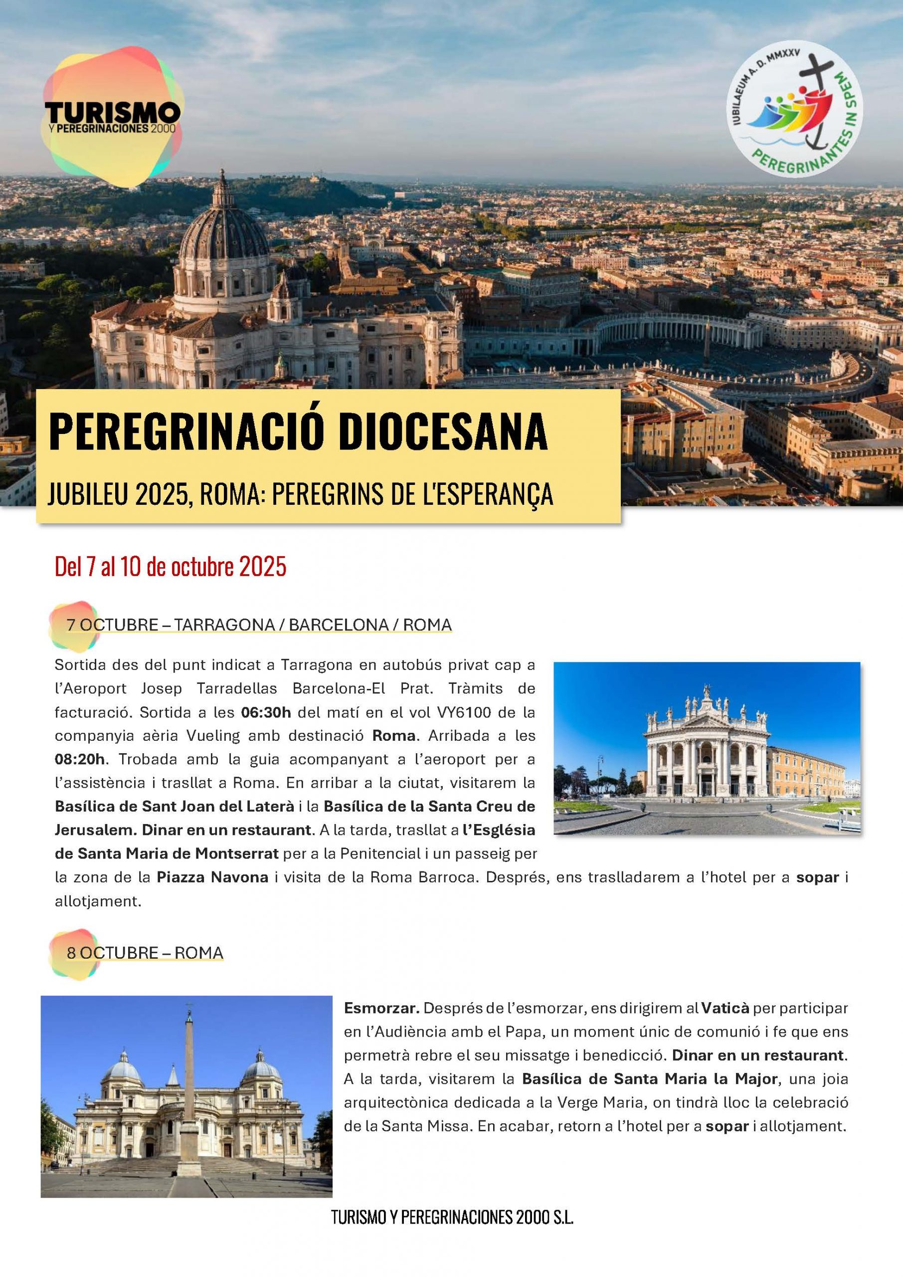 Del 7 al 10 d’octubre d’aquest any 2025 tindrà lloc el pelegrinatge diocesà que, amb motiu de l’Any Jubilar, és organitzat per l’Arquebisbat de Tarragona per a visitar els llocs jubilars de Roma i tenir l’oportunitat de guanyar-hi la gràcia jubilar de la indulgència plenària.